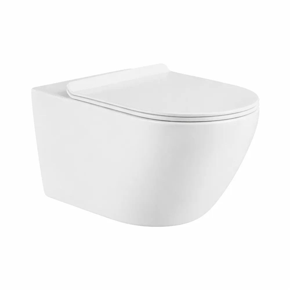 אסלה תלויה מעוגלת אורך 53.5 ס"מ צבע לבן מבריק עם שטיפת רימליס ומושב קשיח טריקה שקטה ונשלף דגם ליסבון