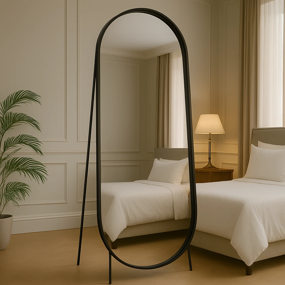 מראת גוף אובלית עומדת עם סטנד עשוי ממסגרת אל חלד צבע שחור מט רוחב 70 ס"מ גובה 180 ס"מ דגם LMB-13