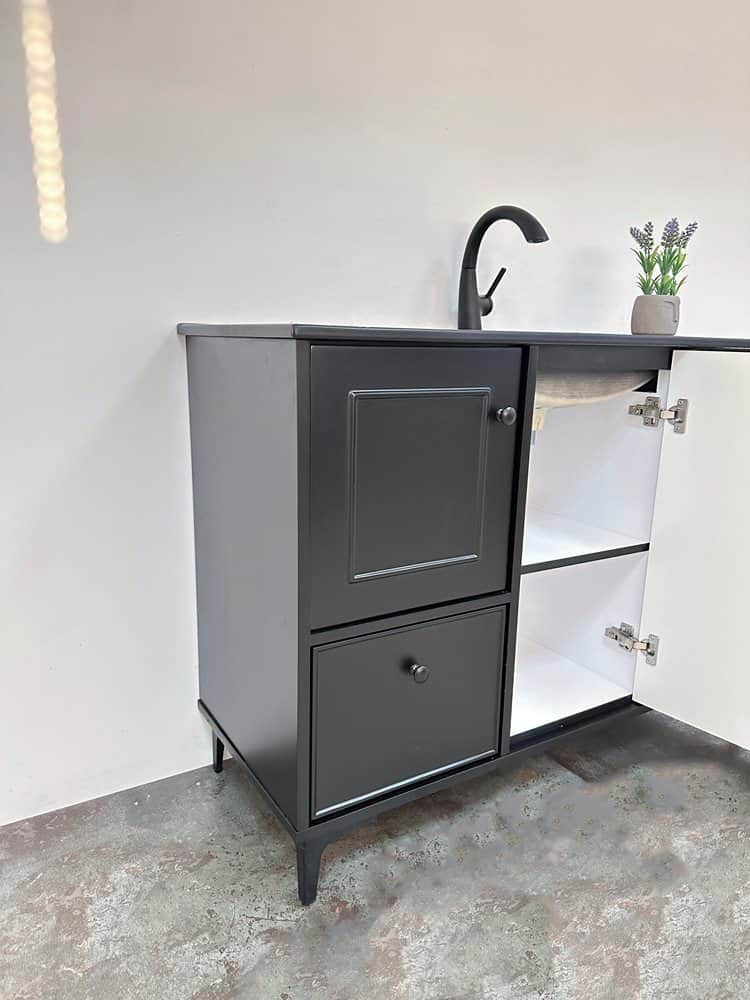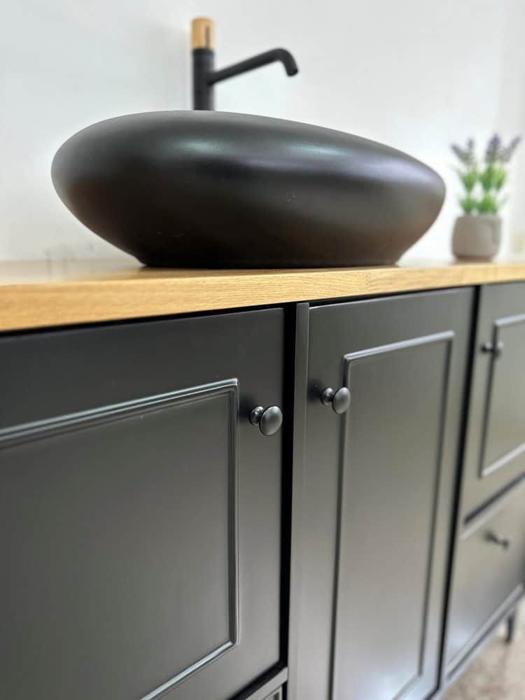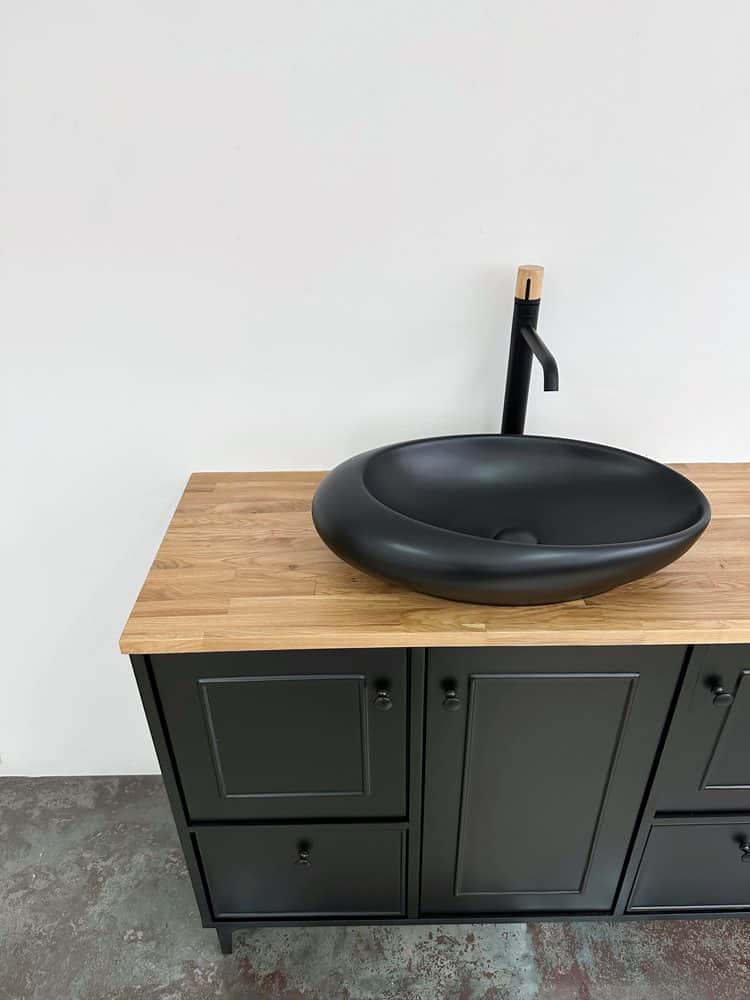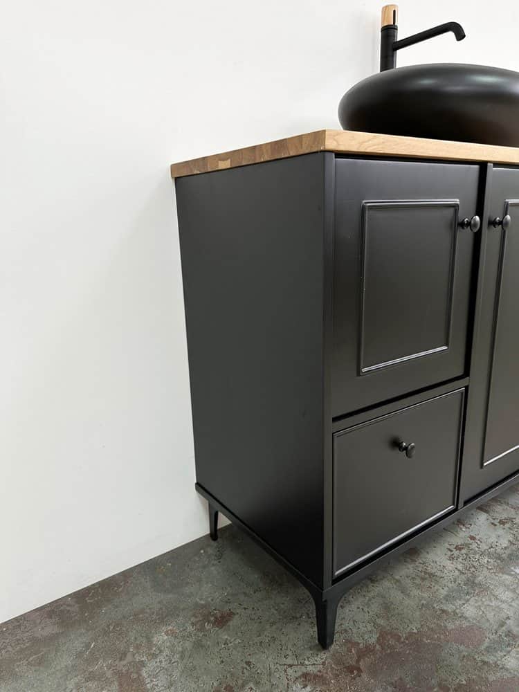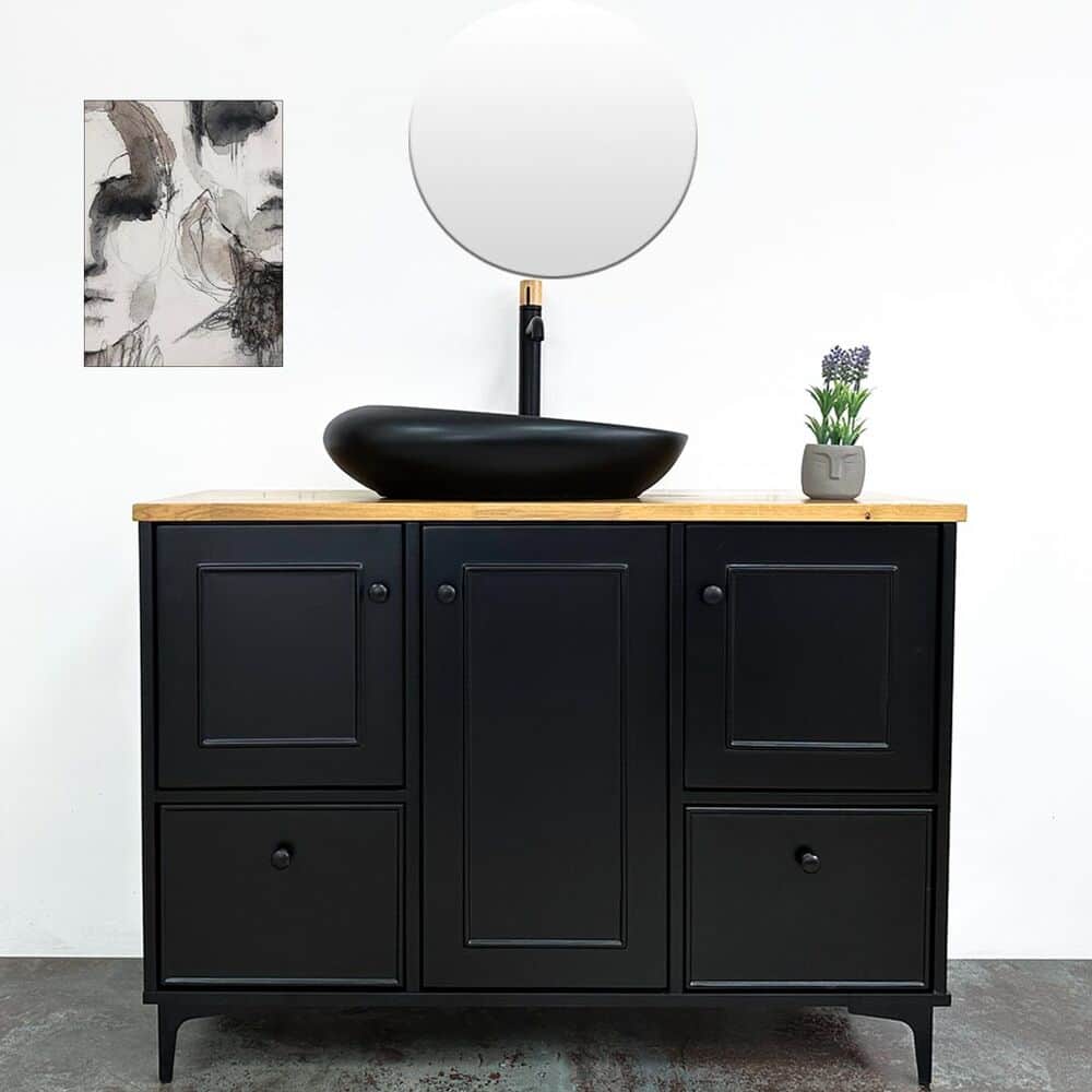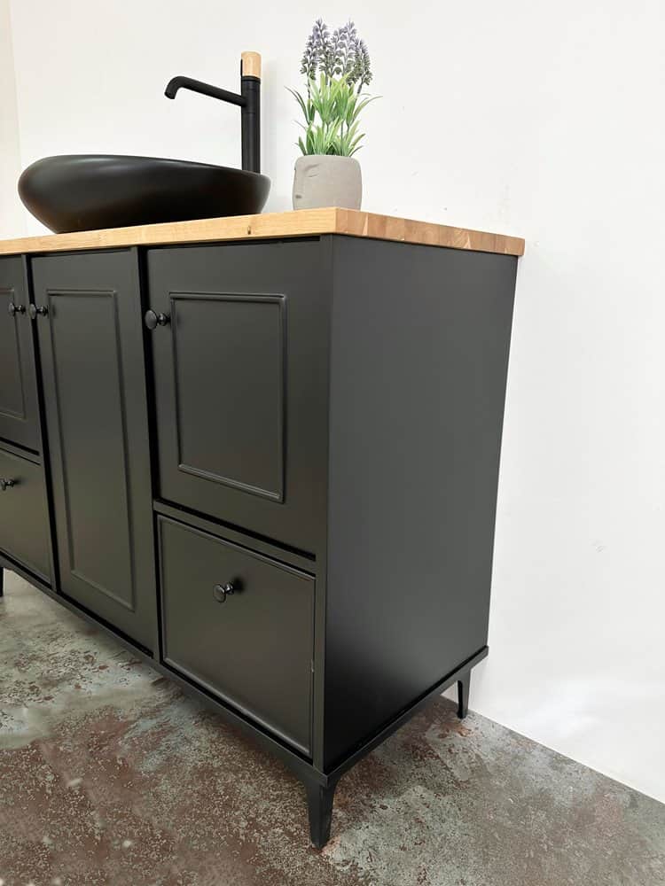 ארון אמבטיה עומד רוחב 120 ס"מ בעומק 46 ס"מ צבע שחור מט עם משטח עץ מלא להנחת כיור מונח דגם האגי 120