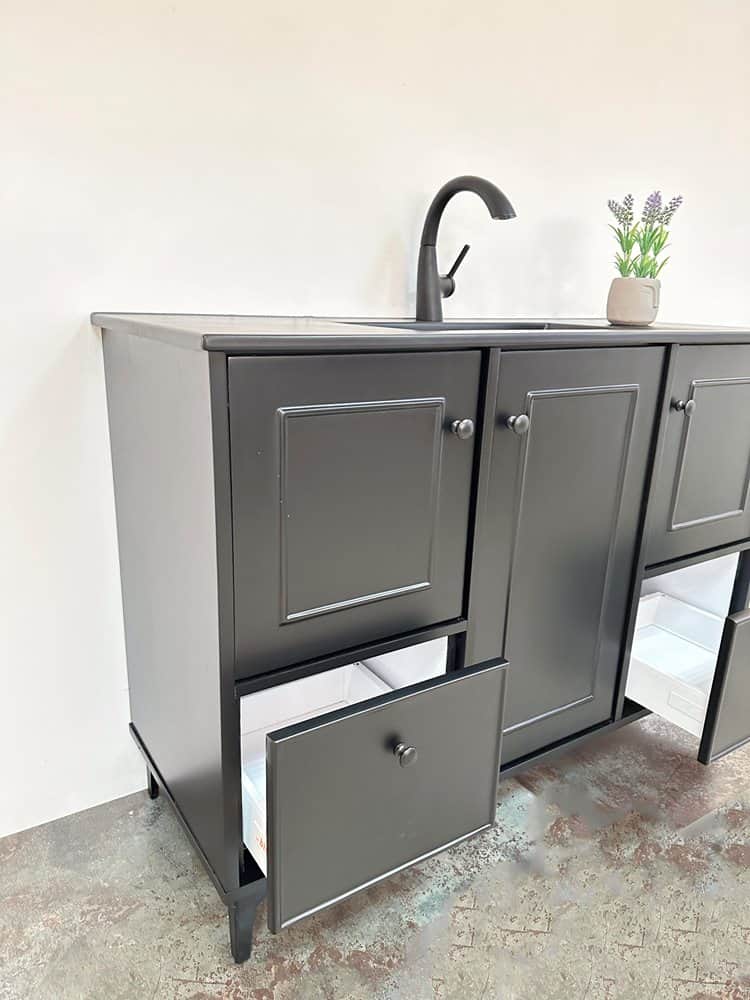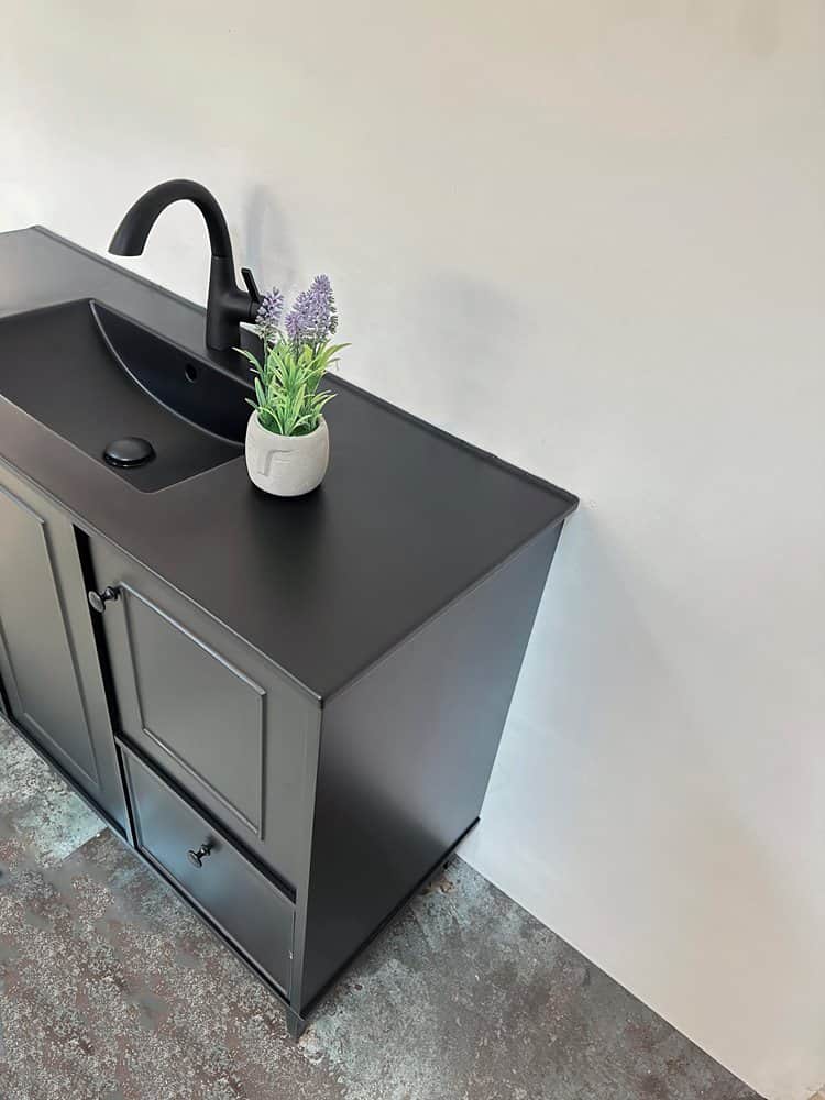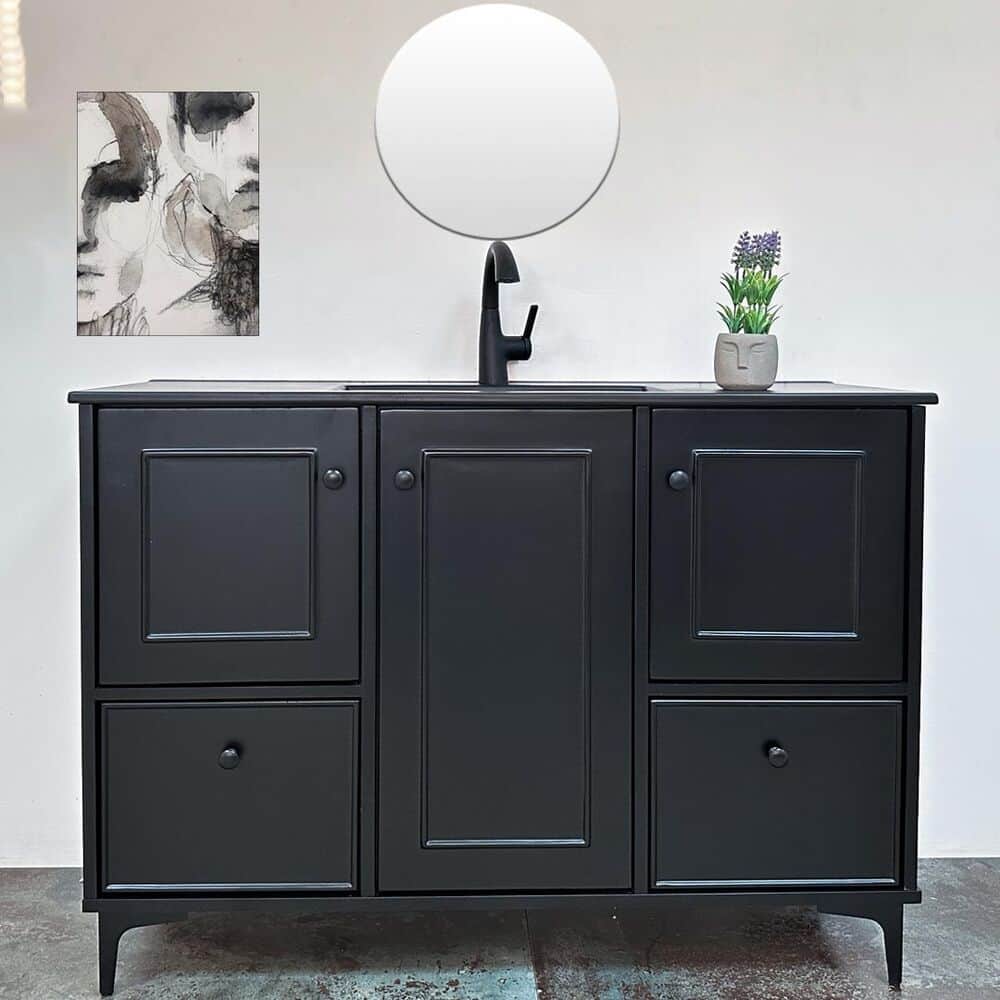 ארון אמבטיה עומד רוחב 120 ס"מ בעומק 46 ס"מ צבע שחור מט עם כיור משטח חרס שקוע דגם אמן 120