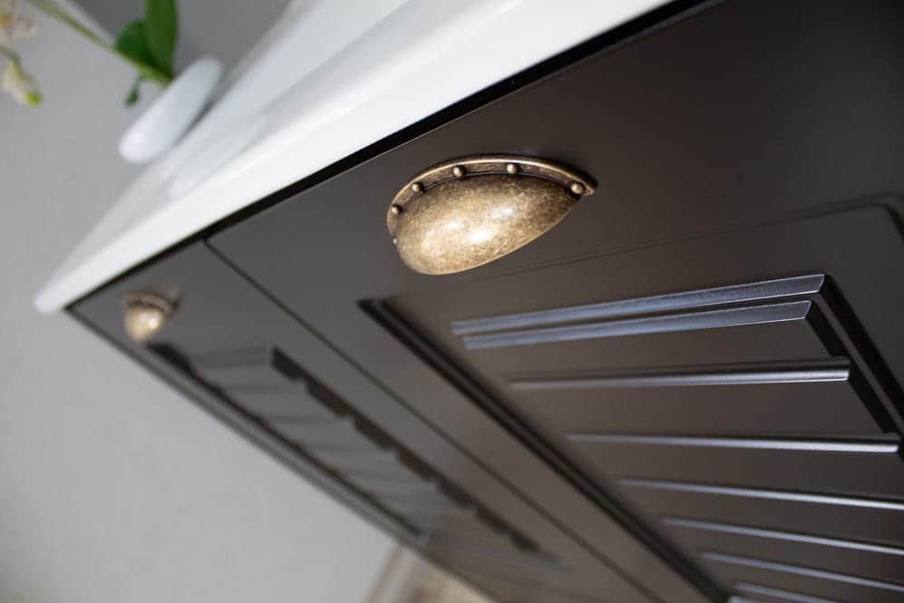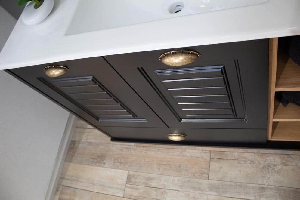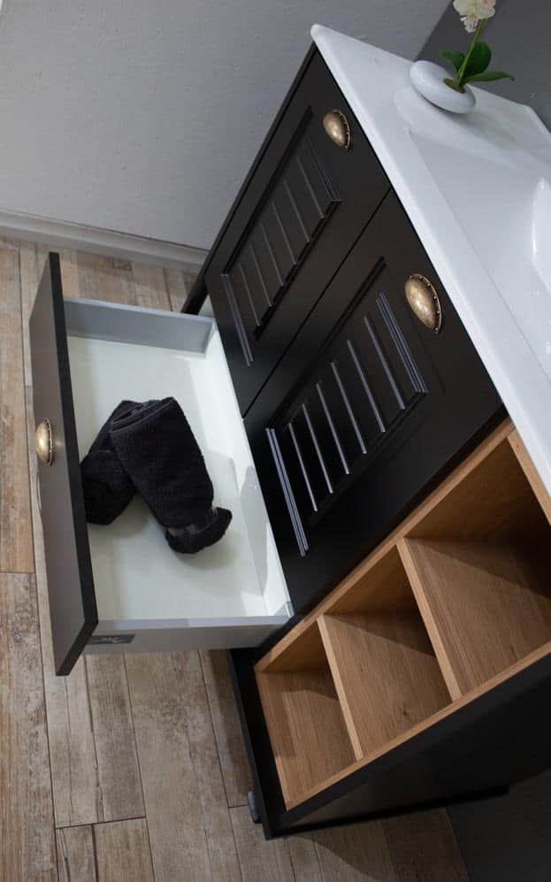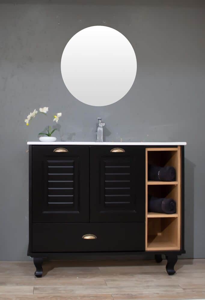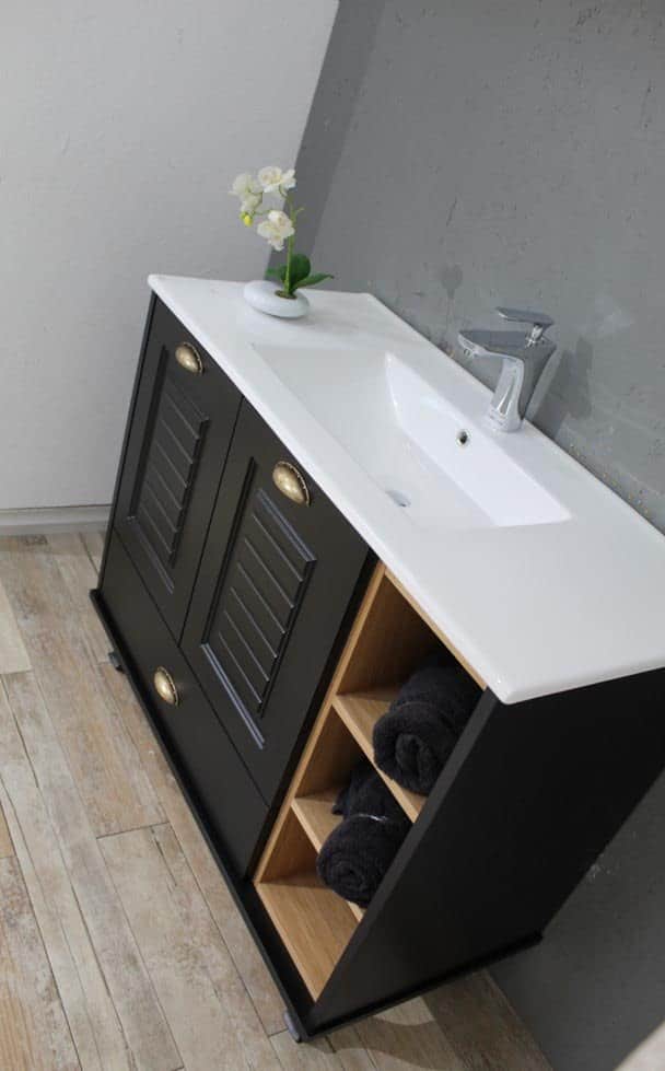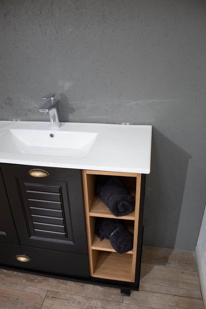 ארון אמבטיה עומד רוחב 80 ס"מ בעומק 46 ס"מ צבע שחור מט עם כיור משטח חרס שקוע דגם רוסטה 80