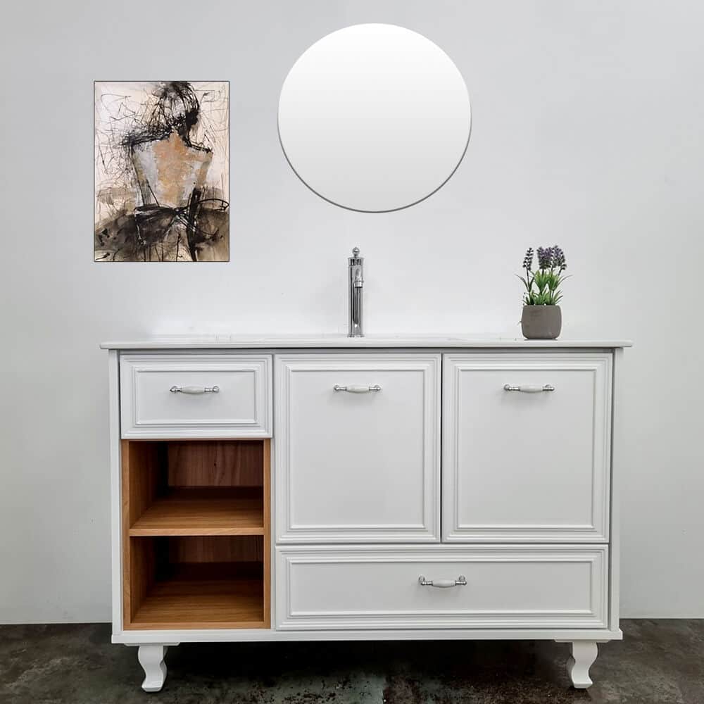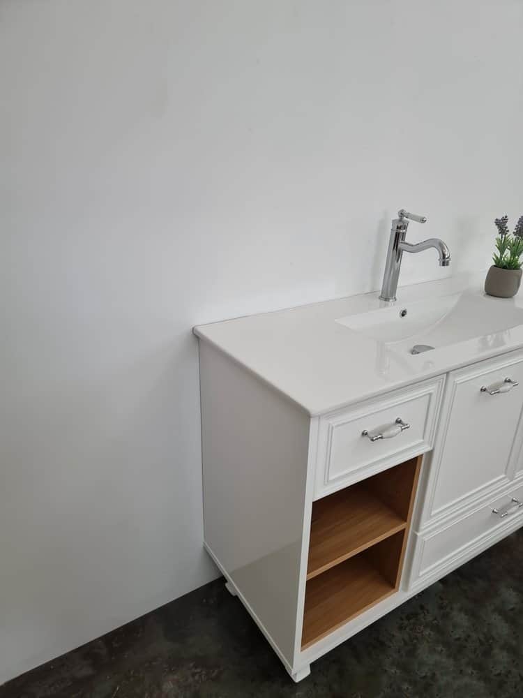 ארון אמבטיה עומד רוחב 100 ס"מ בעומק 46 ס"מ צבע לבן מט עם כיור משטח חרס שקוע דגם פארן 100