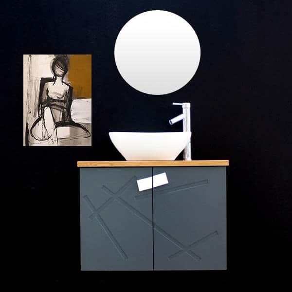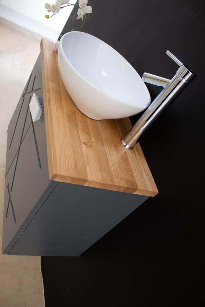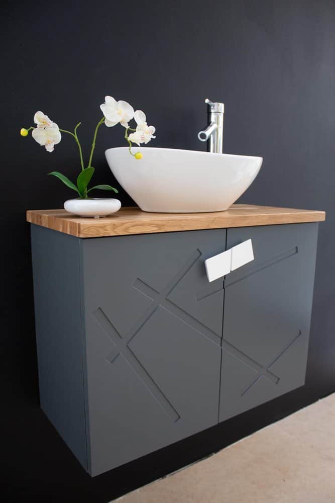 ארון אמבטיה תלוי רוחב 70 ס"מ בעומק 33 ס"מ צבע אפור מט עם משטח עץ מלא להנחת כיור מונח דגם רומניה 70