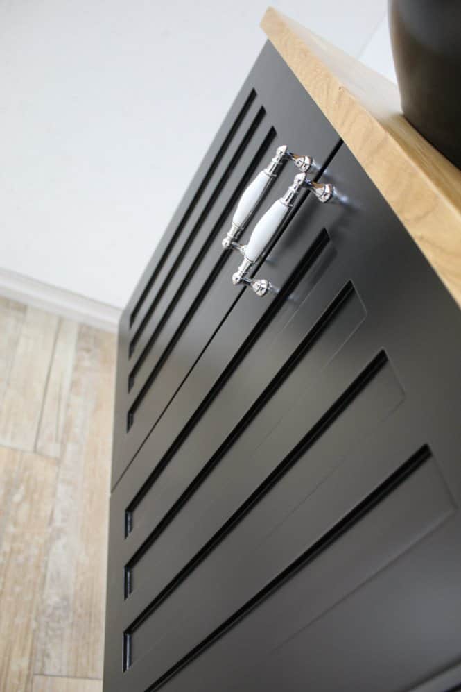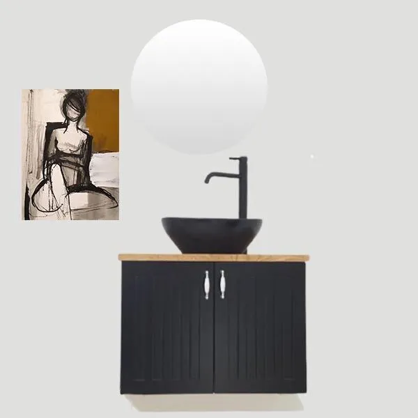 ארון אמבטיה תלוי רוחב 70 ס"מ בעומק 33 ס"מ צבע שחור מט עם משטח עץ מלא להנחת כיור מונח דגם קרמל 70