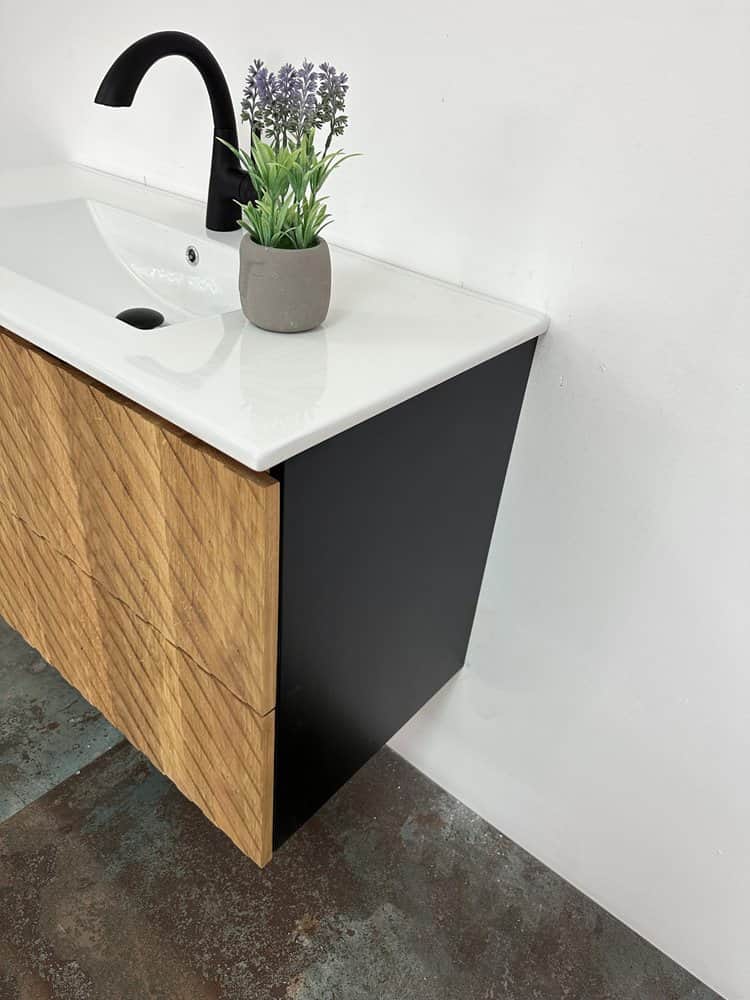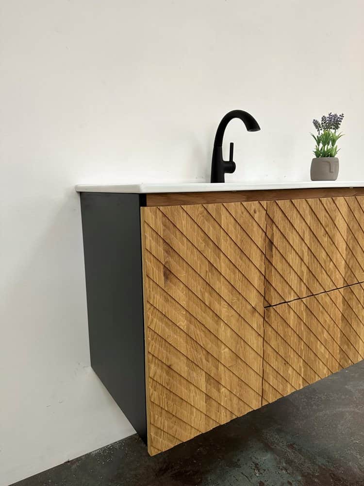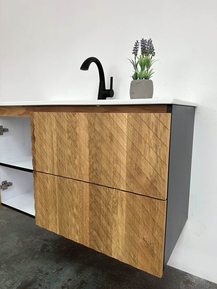 ארון אמבטיה תלוי רוחב 100 ס"מ בעומק 46 ס"מ עשוי מעץ מלא אלון מבוקע עם כיור משטח חרס שקוע דגם אוקסאק 100
