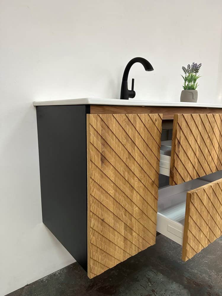 גוף הארון: שילוב עץ מלא אלון מבוקע עם סנדוויץ מיוחד לחדרים רטובים