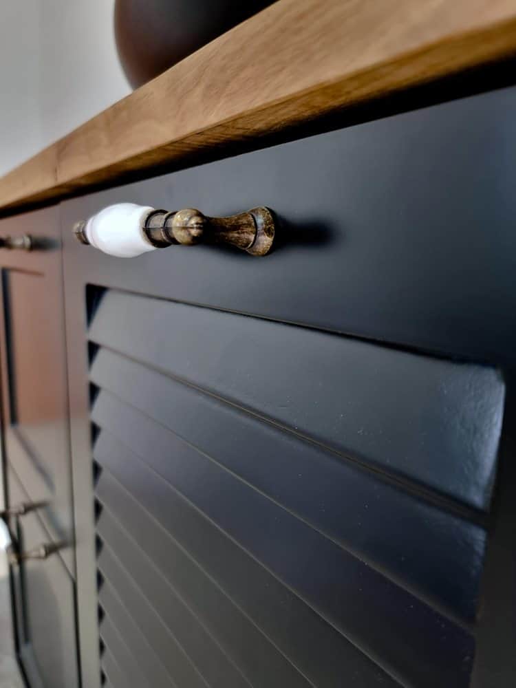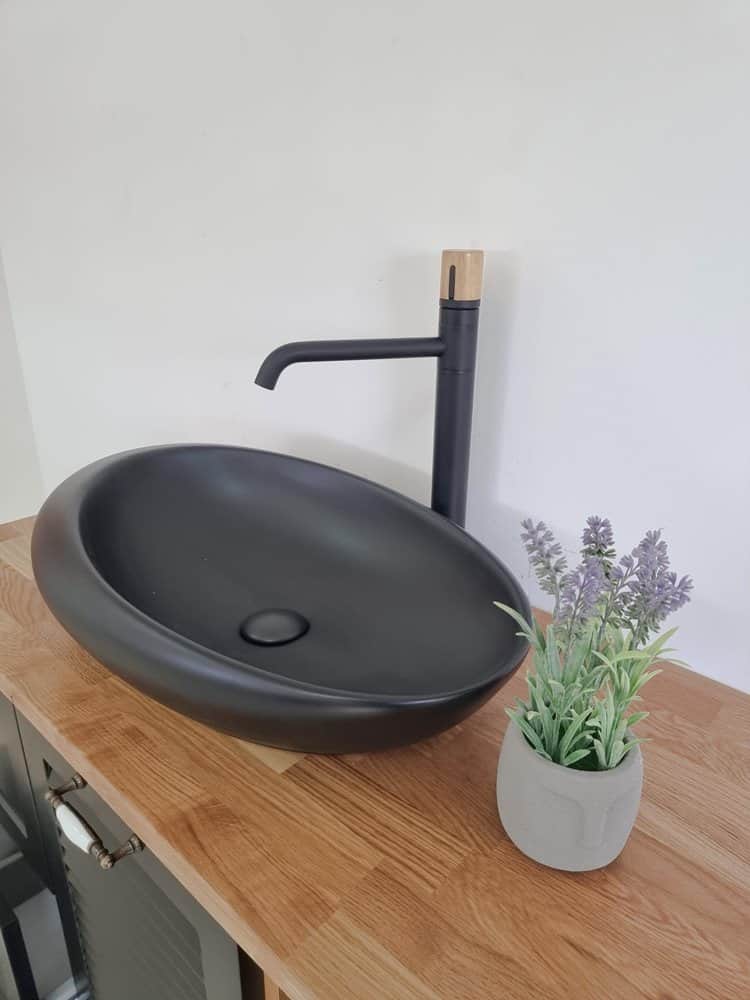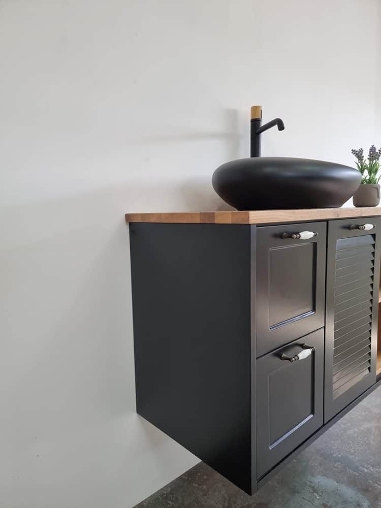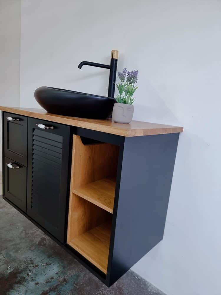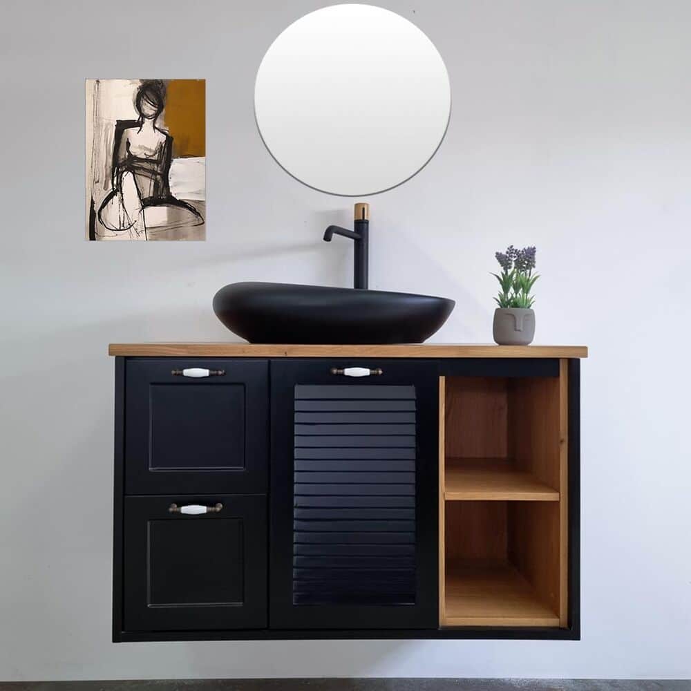ארון אמבטיה תלוי רוחב 100 ס"מ בעומק 46 ס"מ צבע שחור מט עם משטח עץ מלא להנחת כיור מונח דגם פוזה 100