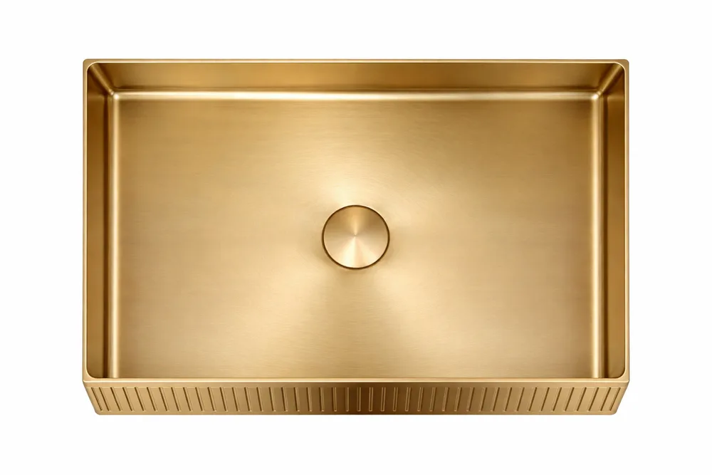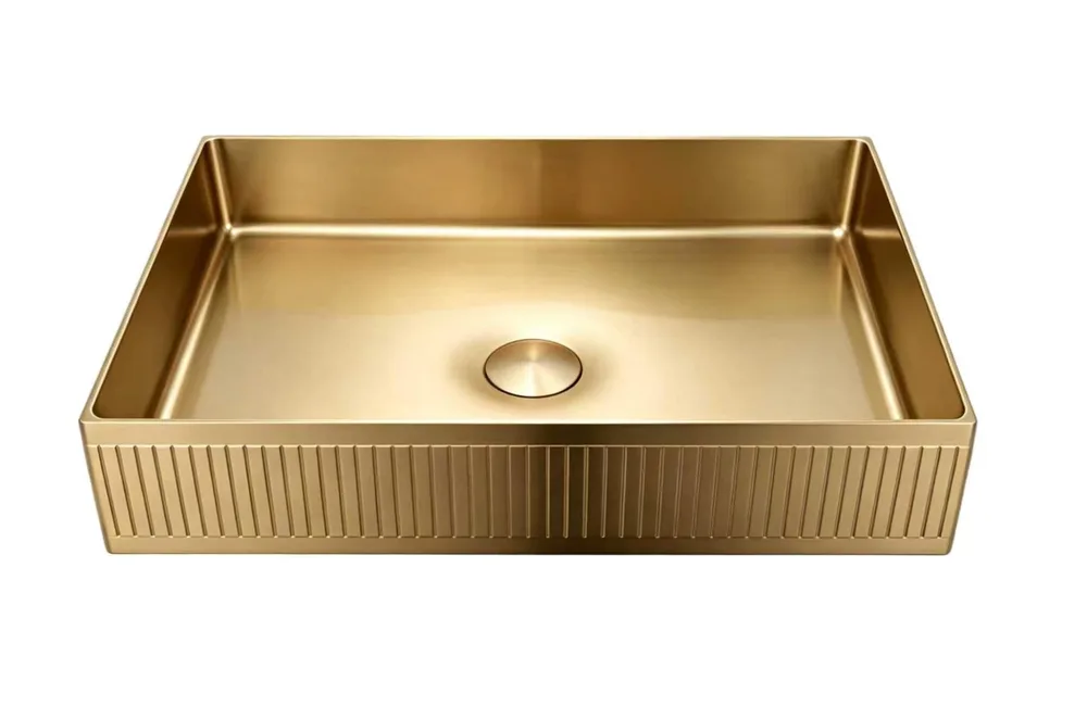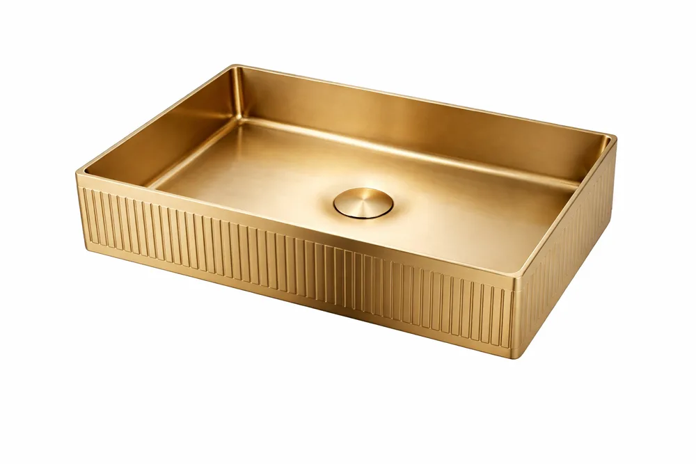 כיור רחצה מונח מלבני בעיצוב פסים עשוי מנירוסטה רוחב 50 ס"מ ועומק 35 ס"מ צבע זהב מט PVD דגם GS-2204